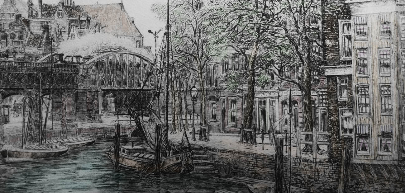 Prachtige ets in Carbon zwart met een afbeelding van ‘Het Volk’ in Rotterdam. Afgebeeld: stoomlocomotief, stadsbeeld, boten